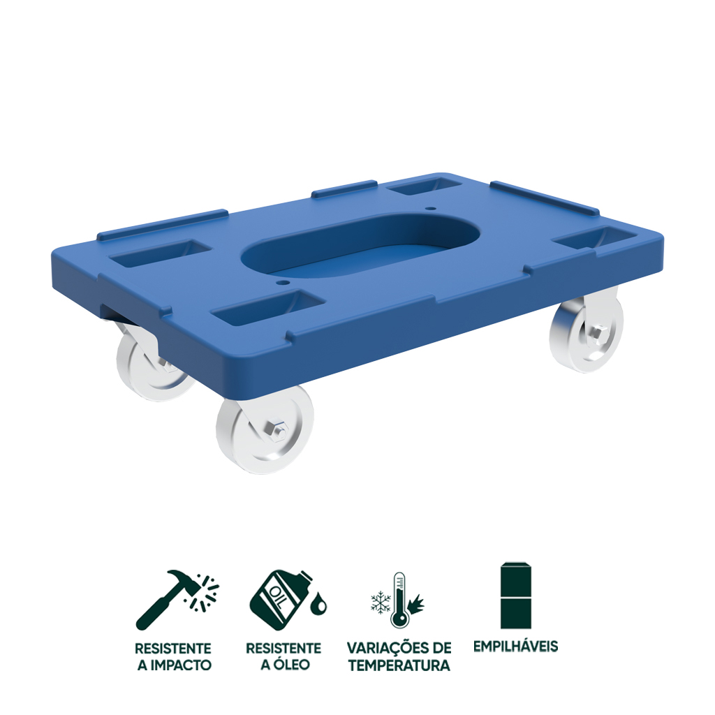- Rodízios de poliuretano; - Rodízios com freio e giratórios (opcional); - Encaixe para empilhamento; - Plataforma maciça; - Travas laterais de segurança - Fundo reforçado; - Possui local para aplicação de cintas de arquear; - Compatível com diversos modelos de caixas.