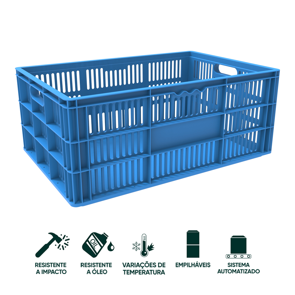 Indicadas para transporte e armazenamento de uso geral. São resistentes e por isso oferecem máxima proteção ao produto e praticidade em seu manuseio. Pode ser usada em diversos segmentos como: laticíneos, colheita de frutas e legumes, frigoríficos, quitandas, feiras livres, supermercados e indústrias. Compatível com a Linha Euro e KLT.