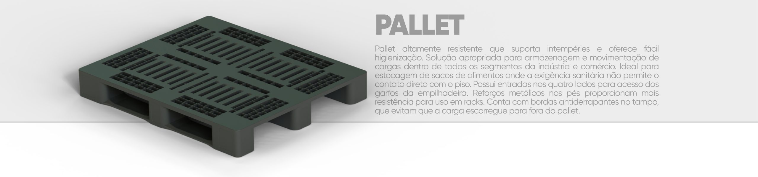 Com a linha PALLET a estabilidade é garantida através de seu design robusto, além de evitar deslizamentos com bordas de segurança, facilitando a organização por serem empilháveis, ideal para centros de distribuição.
